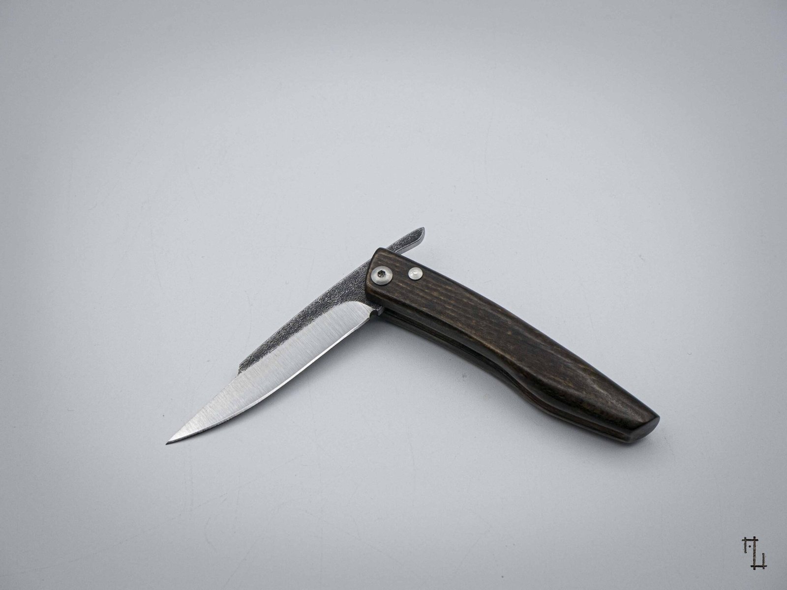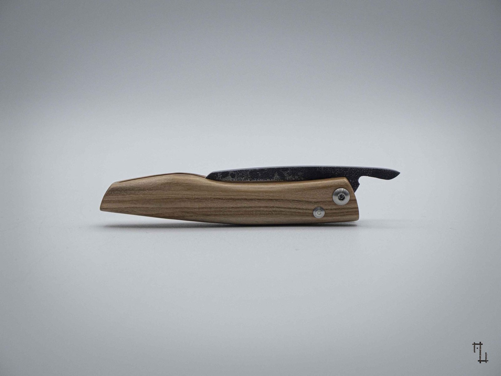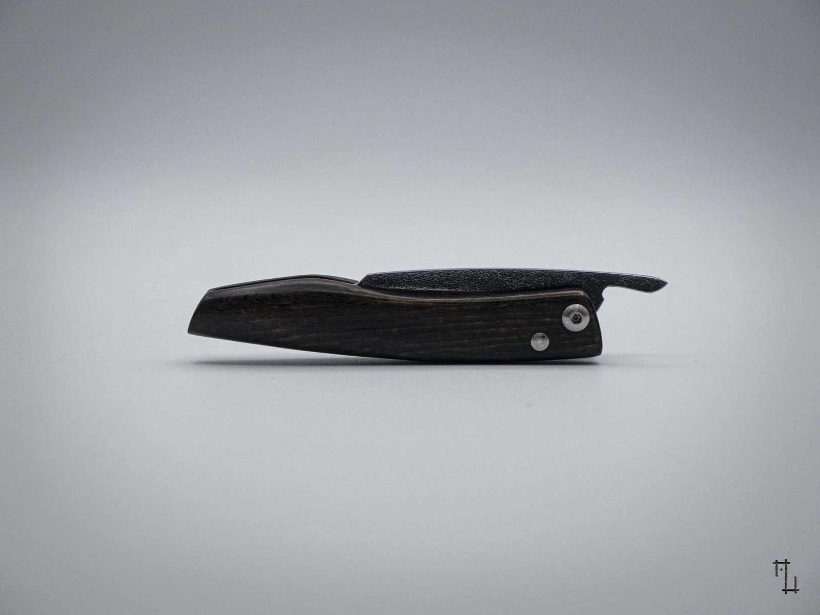 Chiudibile a frizione con chiusura a pressione tra i due perni. Le forme sono state dettate dalla voglia di un design particolare che richiamasse le linee di alcune lame da battaglia tipiche dell’epoca rinascimentale. Pur essendo un piccolo coltello da tasca leggero.