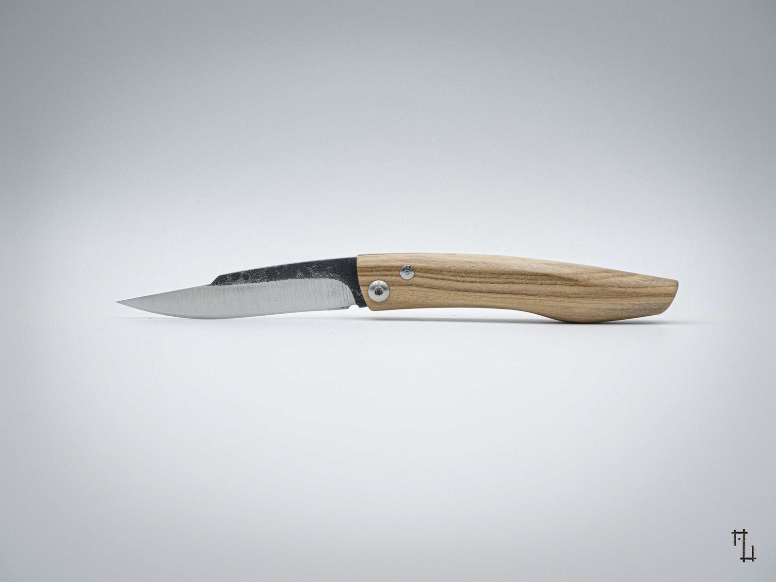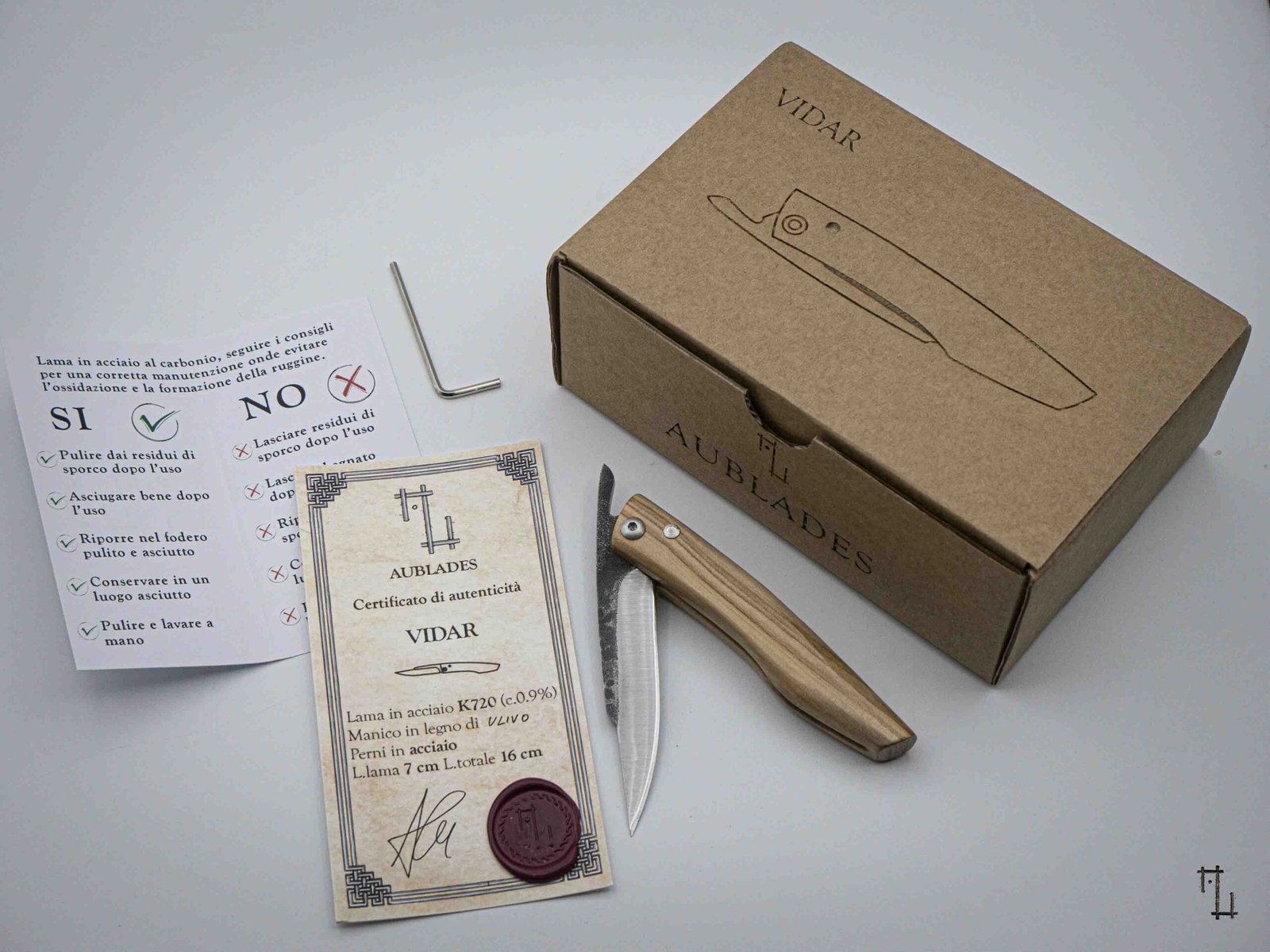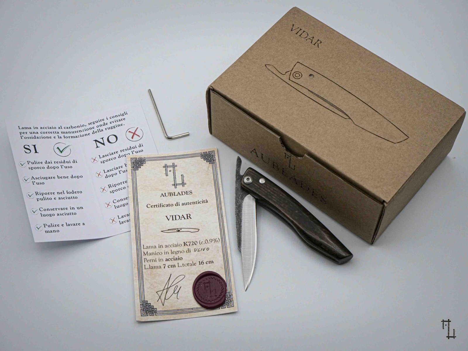 Chiudibile a frizione con chiusura a pressione tra i due perni. Le forme sono state dettate dalla voglia di un design particolare che richiamasse le linee di alcune lame da battaglia tipiche dell’epoca rinascimentale. Pur essendo un piccolo coltello da tasca leggero.