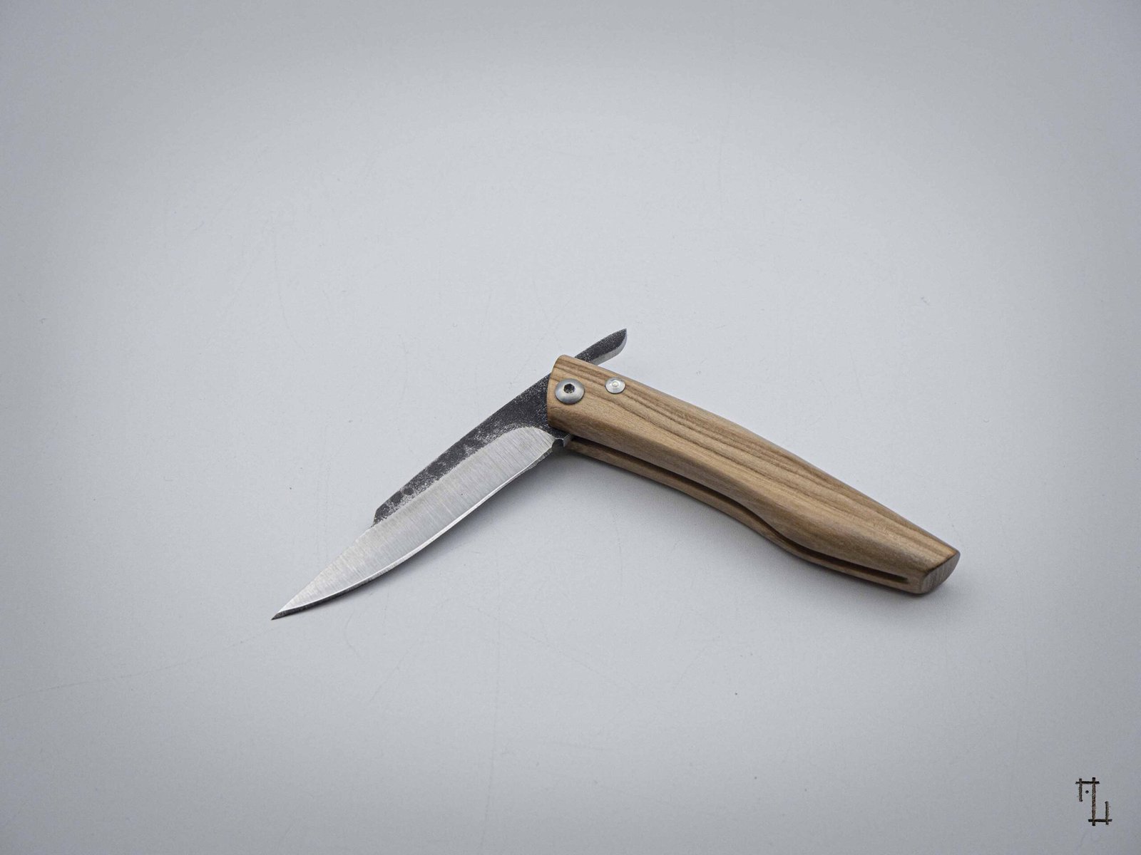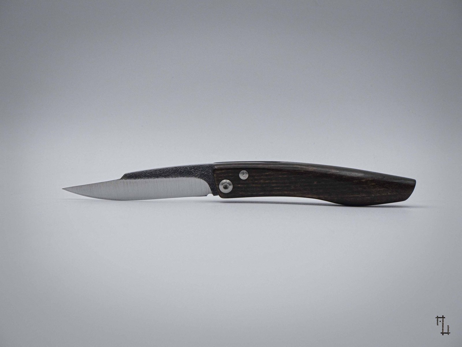 Friction folder with pressure lock between the two pins. The shape were dictated by the desire of a design that recalled the lines of some battle blades typical of the Renaissance era. Lightweight pocket knife.
